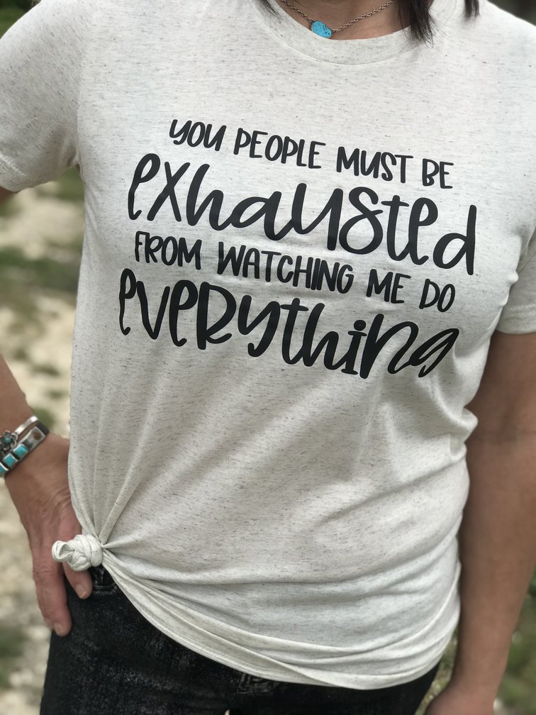 Super soft heather cream unisex true to size fit tee with saying "You people must be exhausted from watching me do everything"