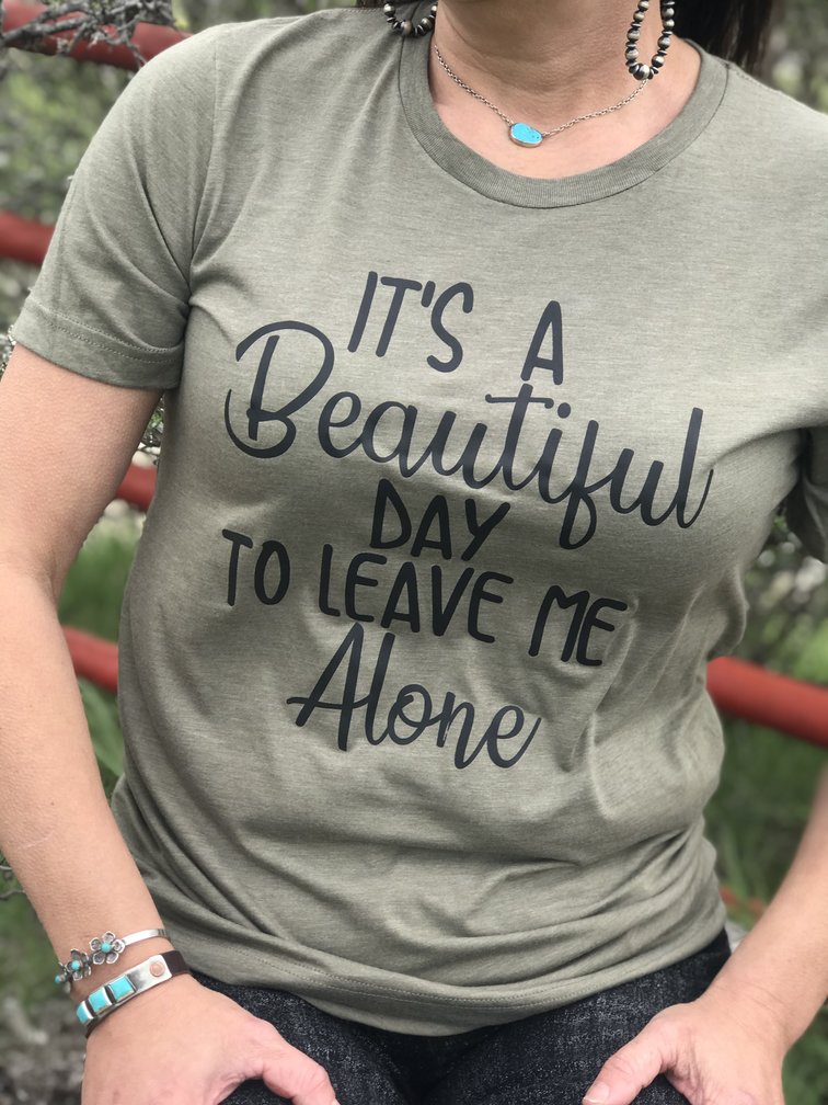 Super soft olive unisex true to size fit tee with saying "It's a beautiful day to leave me alone"